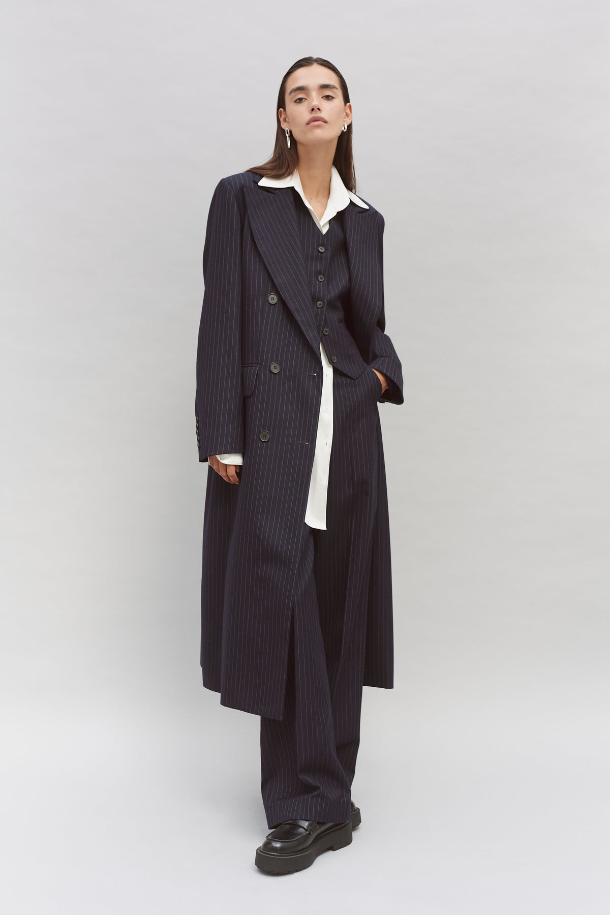 Our oversized double breasted tailored wool coat is made with 100% pinstripe wool woven in Yorkshire. The lining is sustainable made from FSC & Eco Vera viscose. The coat is long in length, it features an oversized lapel detail, horn buttons and two front pockets with a flap. The thread used on this garments is sustainable.
