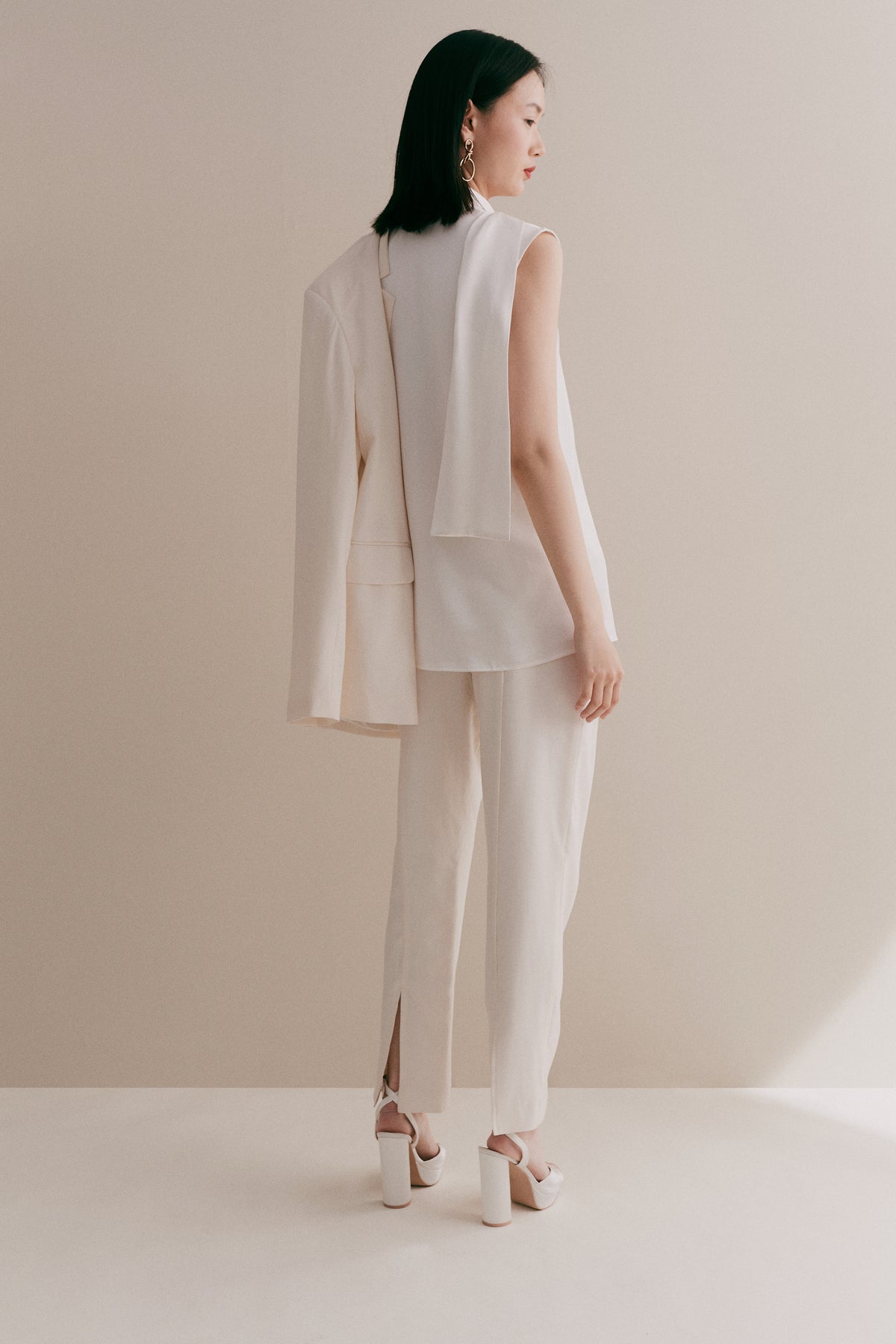 Our Ivory split hem tailored trousers are made of 100% wool, from Savile Row's Holland and Sherry. The trouser features pleated fronts, slanted entry front pockets, invisible front closure and splits at the back hem. The trousers can be worn with or without a belt as the waistband has belt loops. They can be worn as a full suit with either of our bridal suit jackets.