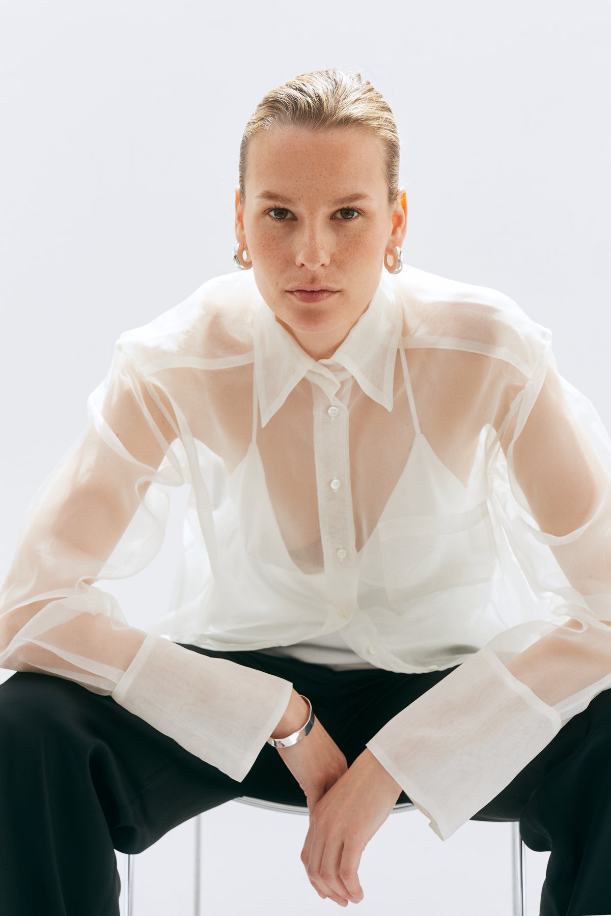 Our Ivory Silk Organza oversized tailored shirt is made of 100% Silk. The shirt features a traditional collar, button stand with mother of pearl buttons and oversized cuffs with our signature button detail. Slip photographed with is sold separately.