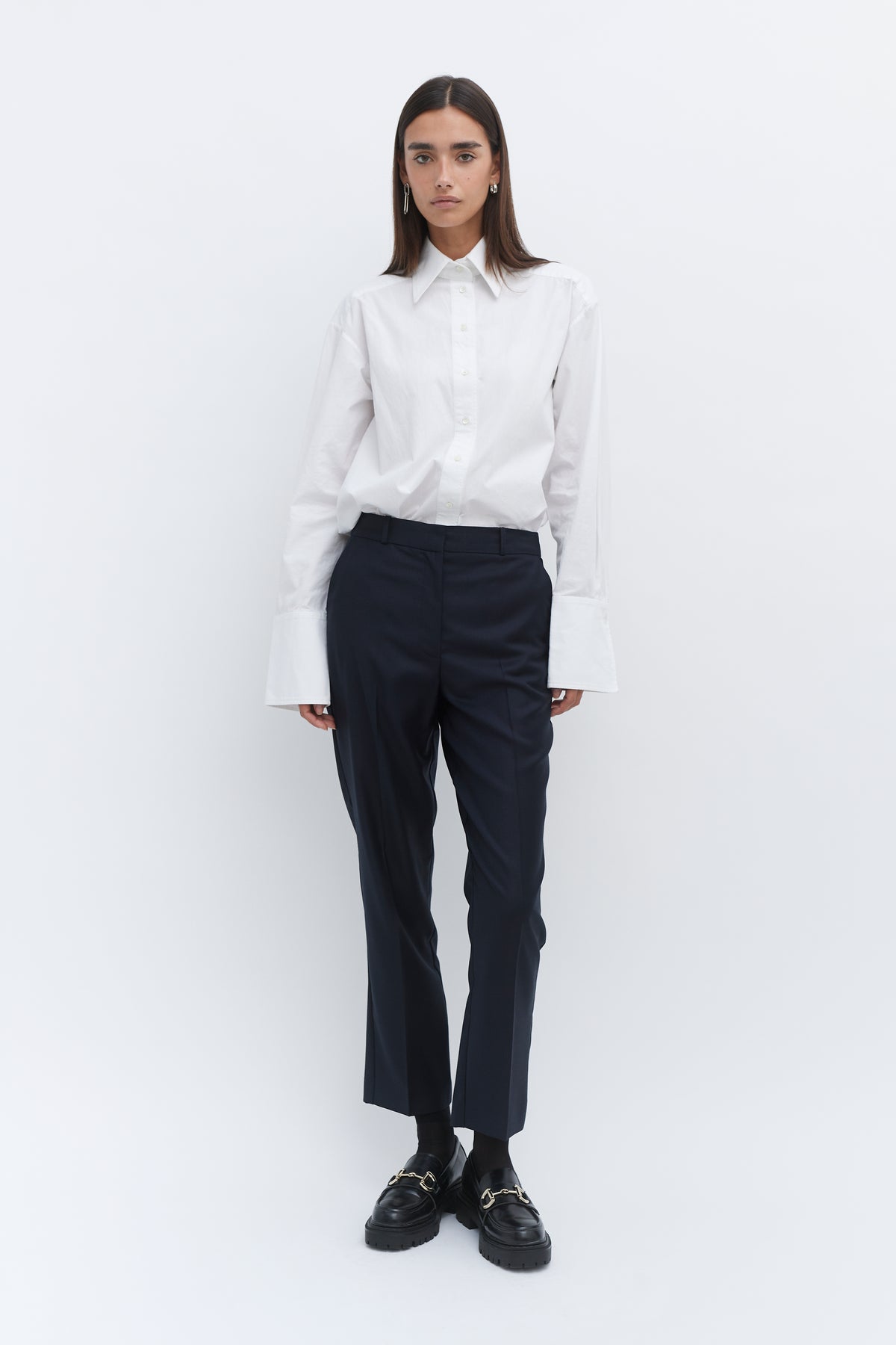 Our navy split hem tailored trousers are made of 100% wool woven in Yorkshire. The trouser features pleated fronts, slanted entry front pockets, invisible front closure and splits at the back hem. The trousers can be worn with or without a belt as the waistband has belt loops. They can be worn as a full suit with the matching Single Breasted Blazer.