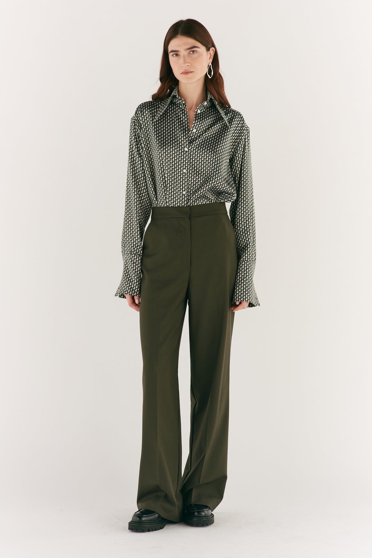 Our wide leg olive green tailored trousers are made of 100% wool, woven in Yorkshire. The trouser features creased fronts, slanted entry front pockets, invisible front closure and are lined to the knee in sustainable lining. The internal waistband and fly features a bias binding finish. They can be worn as a full suit with the matching olive green Single Breasted Blazer.