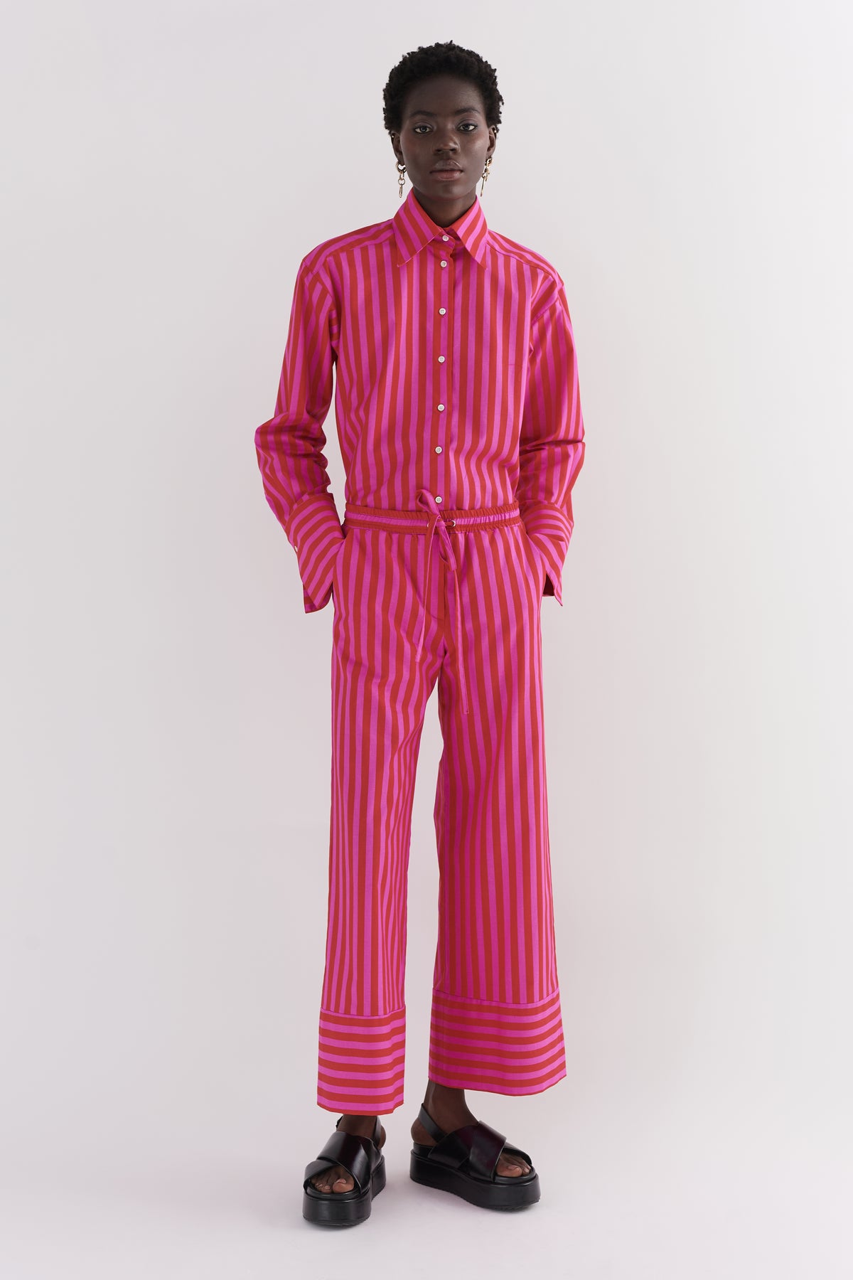 A pink and red candy stripe stripe trouser made of 100% cotton. The wide leg floaty trousers features an elasticated waist with a drawstring detail, side entry pockets and a cuff design detail at the trouser hem.