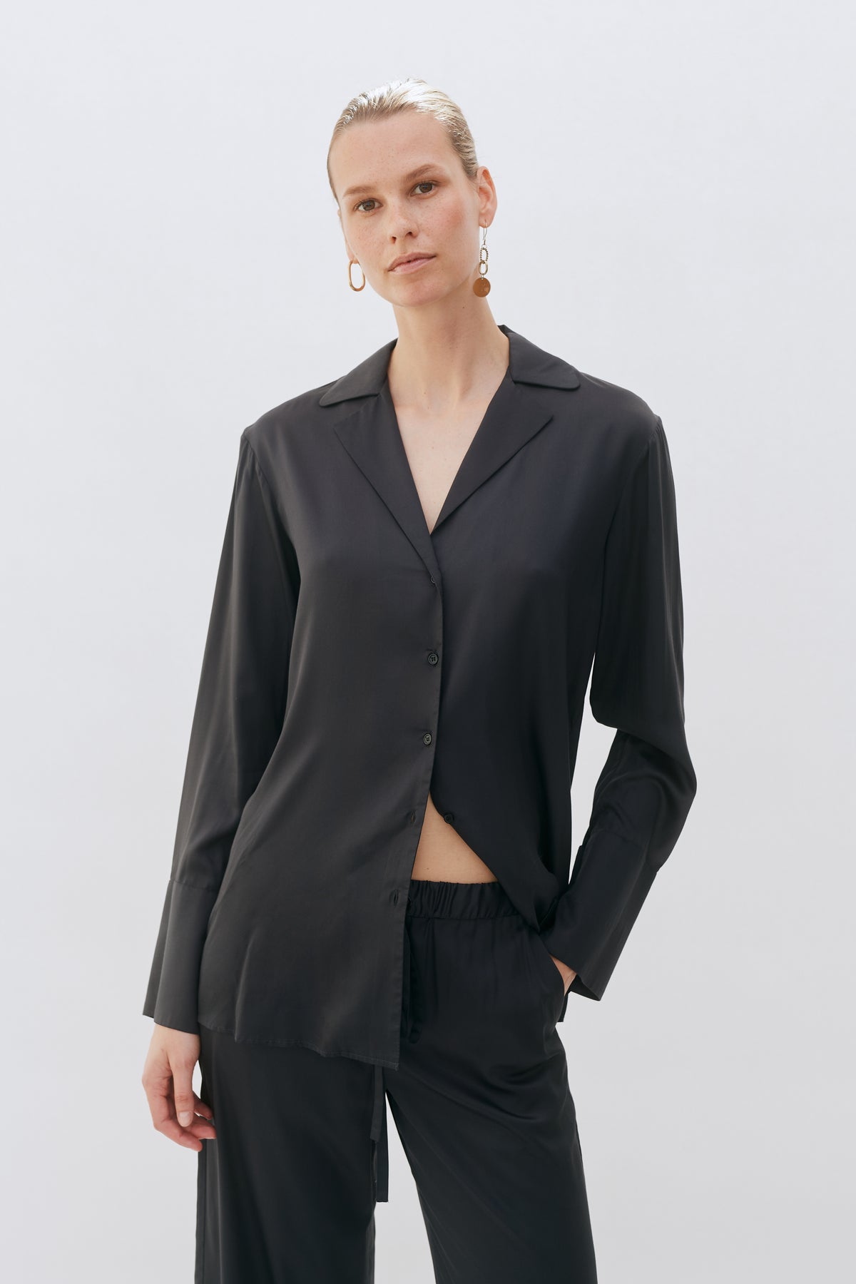 A shirt made of 100% organic bamboo silk. The shirt features a classic pyjama style collar, a visible button down front and oversized cuffs with our signature button detail.