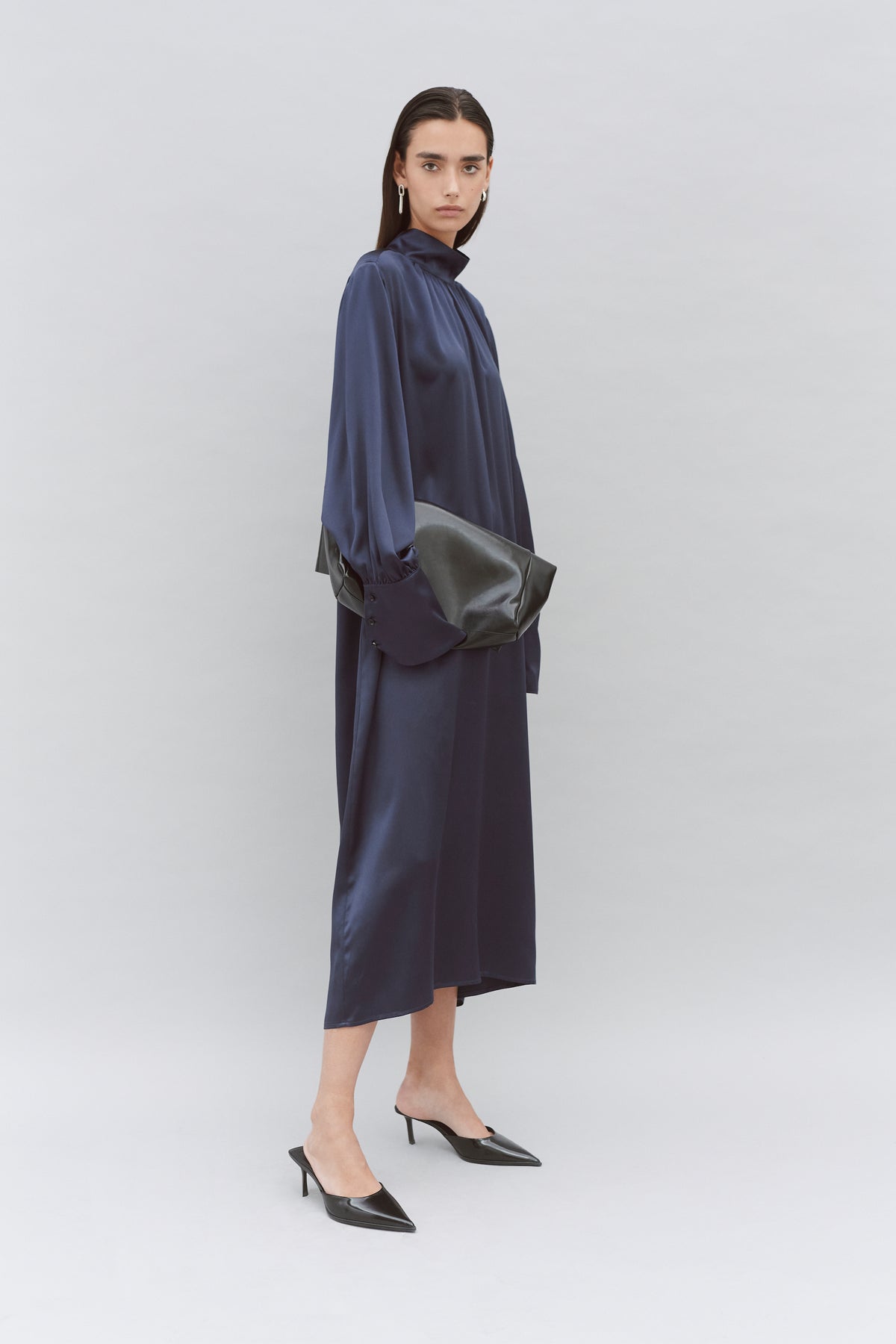 Our floaty oversized navy dress is made of 100% silk. The dress features a mock neck collar with gathering, our signature oversized cuffs with workable four button detail and gathering at the sleeve.