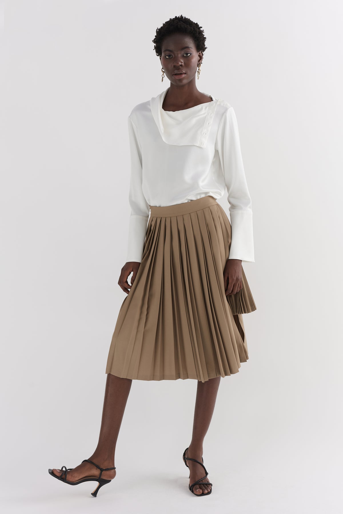 Our Khaki contrast pleated skirt is made of 100% wool, woven in Yorkshire at the mill Alfred Brown. The skirt is hand pleated in London. The skirt features two contrast pleats and a side entry invisible zip.