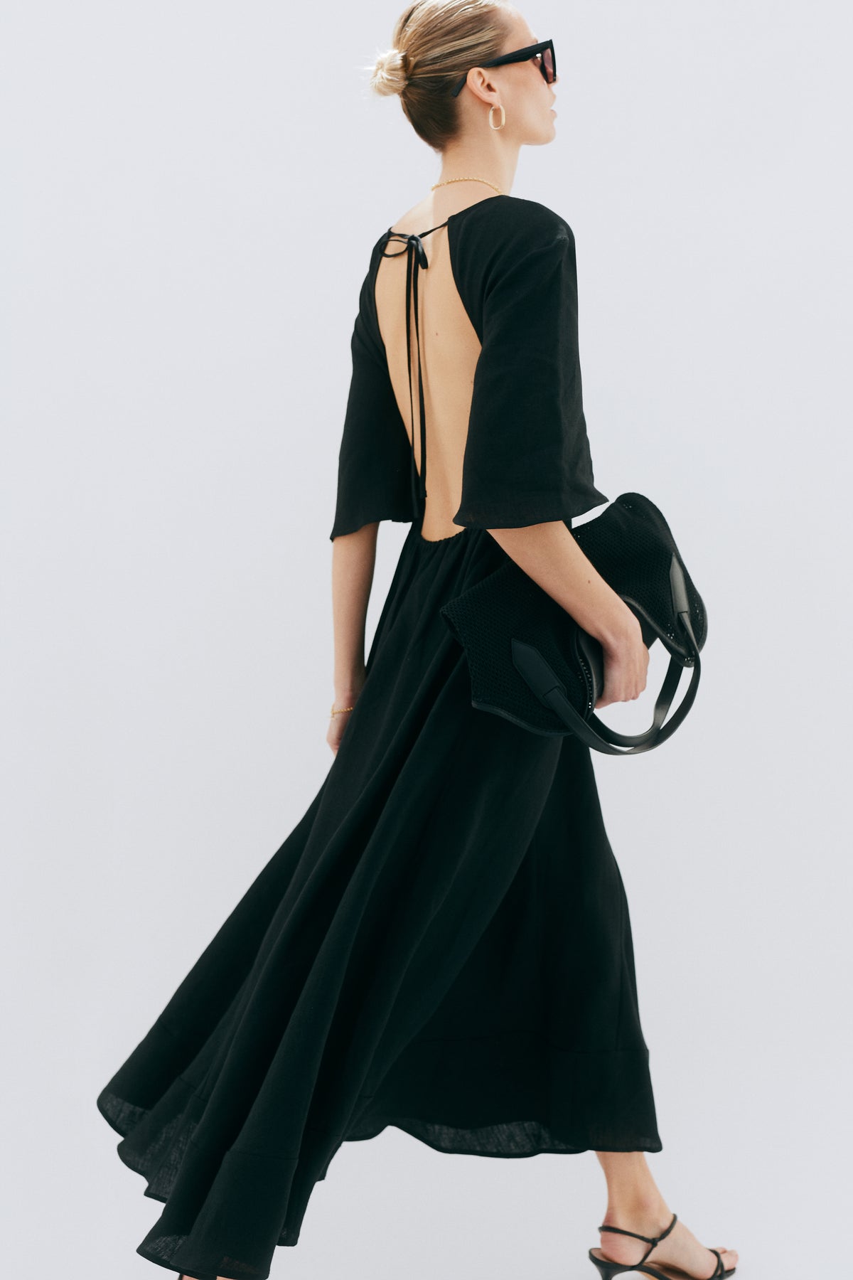 Shop our floaty open back black linen dress made of 100% linen. The dress features oversized sleeves and floaty skirt with a v neck shape at the front. The perfect dress to take you from the city to your holiday destination. The elegant dress features a statement open back detail. The dress is extra long in length (to the floor) please note the model is 185cm Tall.