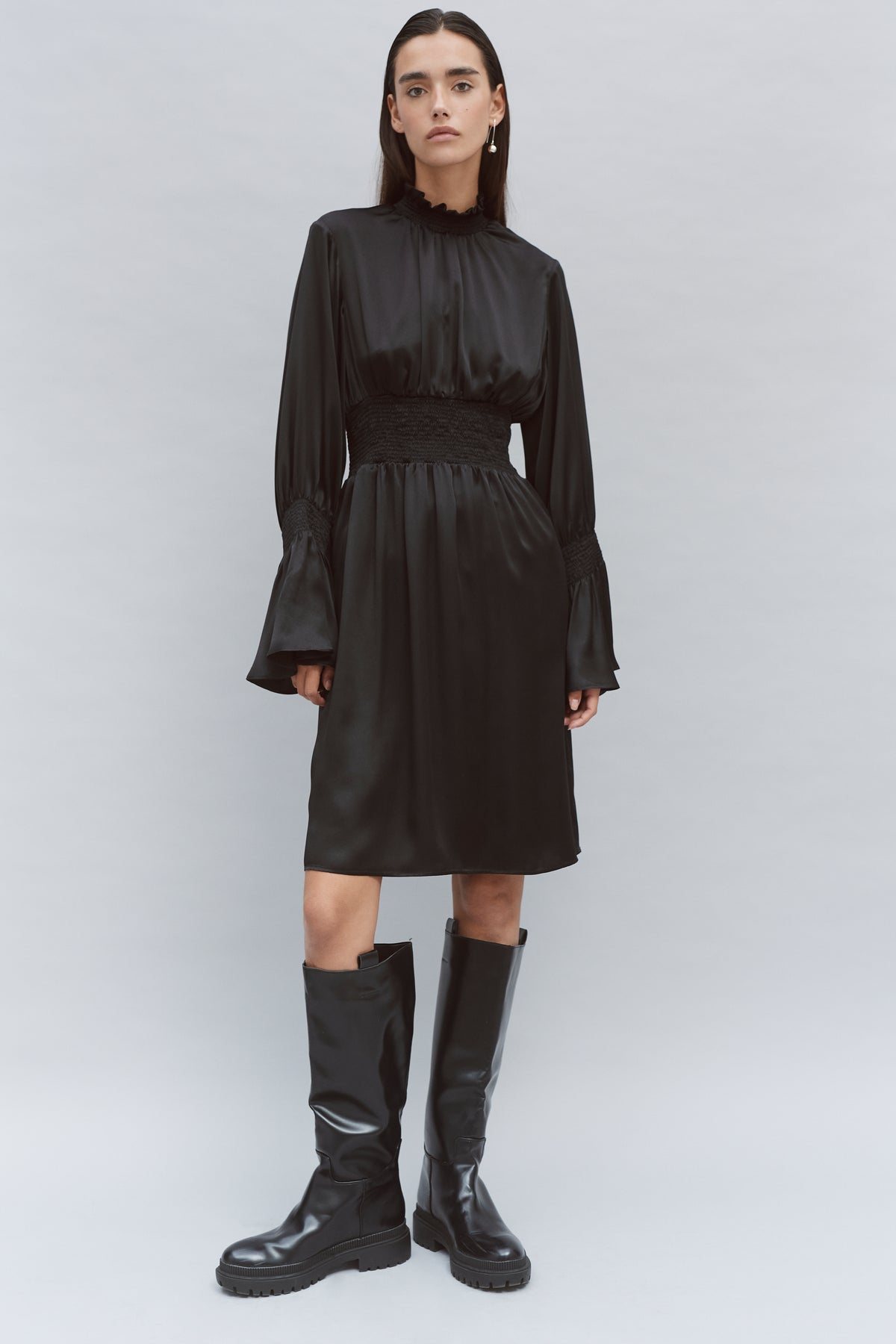 Shop our floaty smocked silk dress made of 100% Black Silk. The dress features smocked details at the waist, collar and our signature LP oversized smocked cuffs. Centre back invisible zip opening and closure. Sustainably made with love in London.