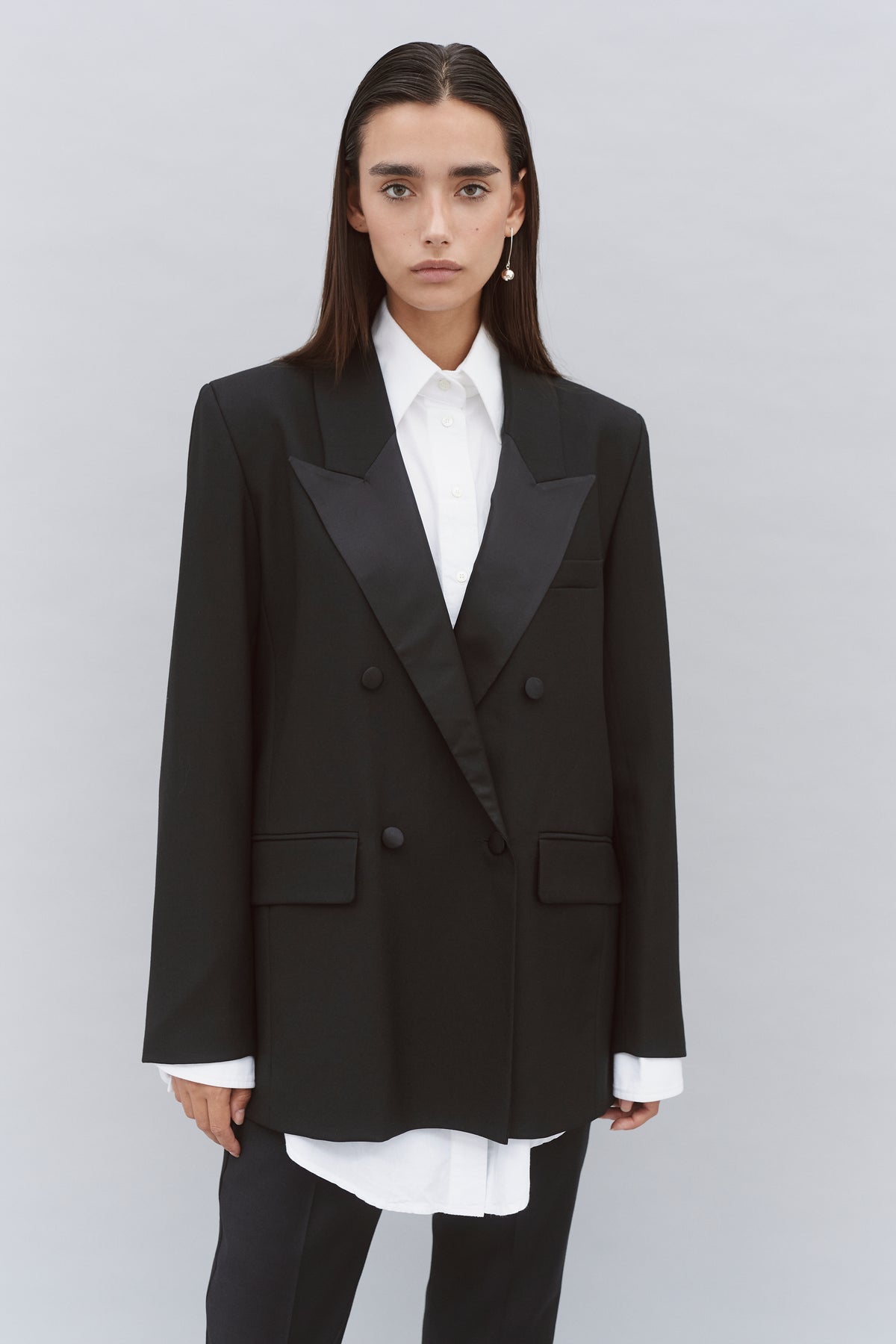 Our tailored tuxedo jacket is made of 90% wool, 5% mohair woven in Yorkshire and 5% silk. The lining is sustainably made from FSC & Eco Vera viscose. Long in length, the jacket features a contrast silk lapel and internal facing, silk covered buttons at the jacket front and sleeves. The jacket can be worn as a full suit with the matching Tuxedo Trousers.