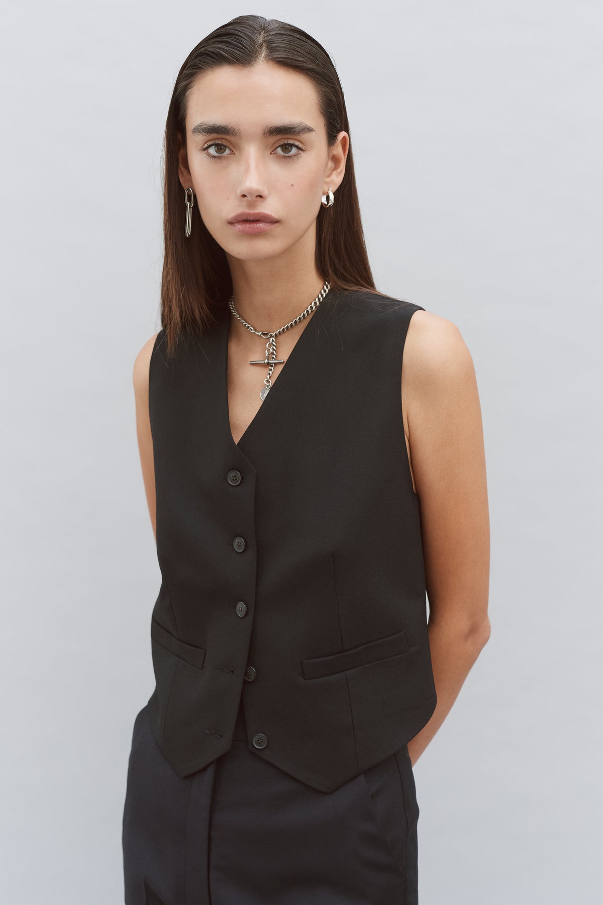 Black waistcoat made from 100% Wool woven in Yorkshire. The waistcoat features sustainable buttons and two front pockets with flaps. The lining is sustainable made from FSC & Eco Vera viscose. The waistcoat can be worn as a full suit with the Pinstripe jacket and wide leg trouser.