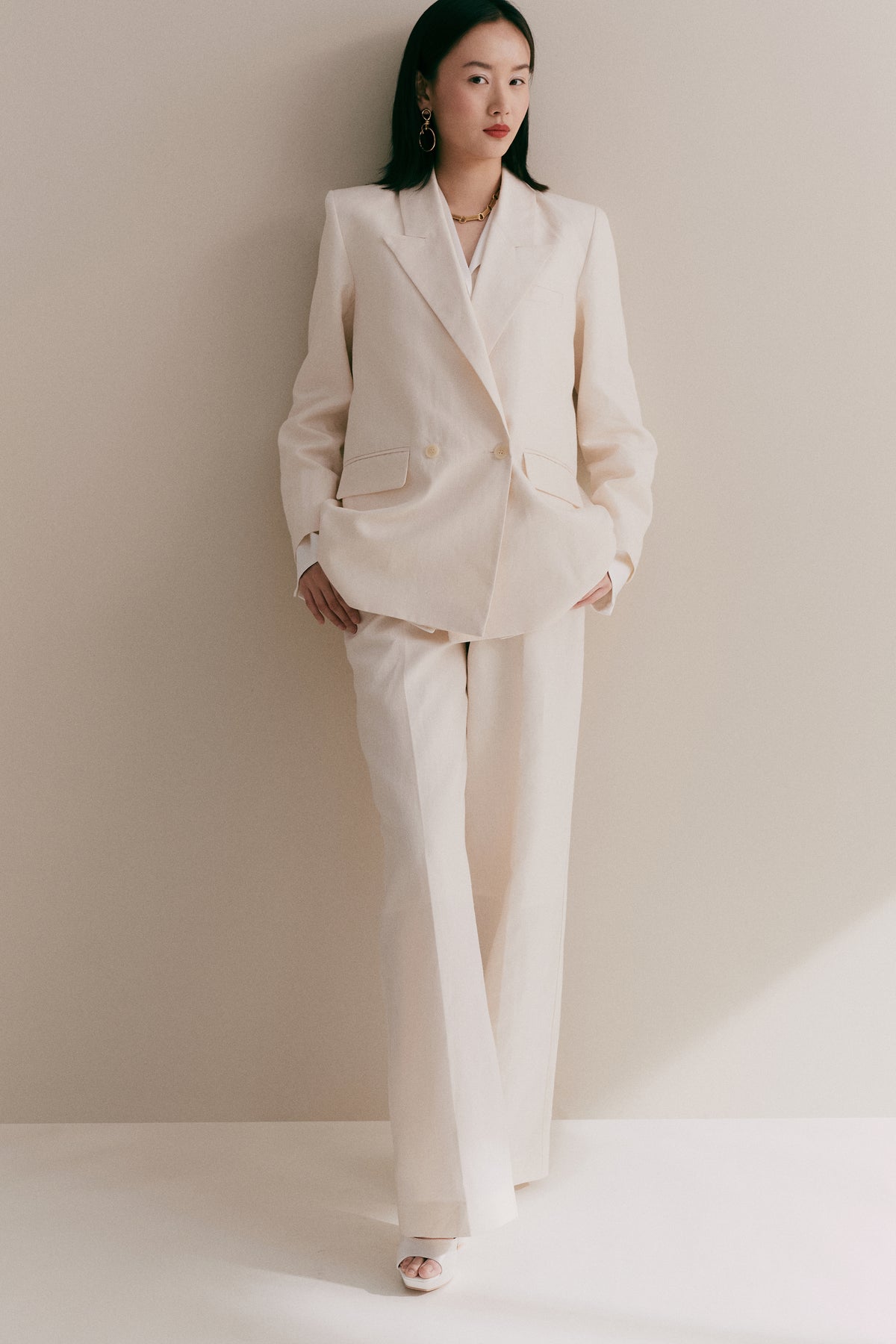 Our Ivory double breasted tailored jacket is made of 100% Linen. The jacket features sustainable buttons and two front pockets with flaps. The lining is sustainable made from FSC & Eco Vera viscose. The jacket can be worn as a full suit with the matching Ivory Linen Wide Leg trouser.
