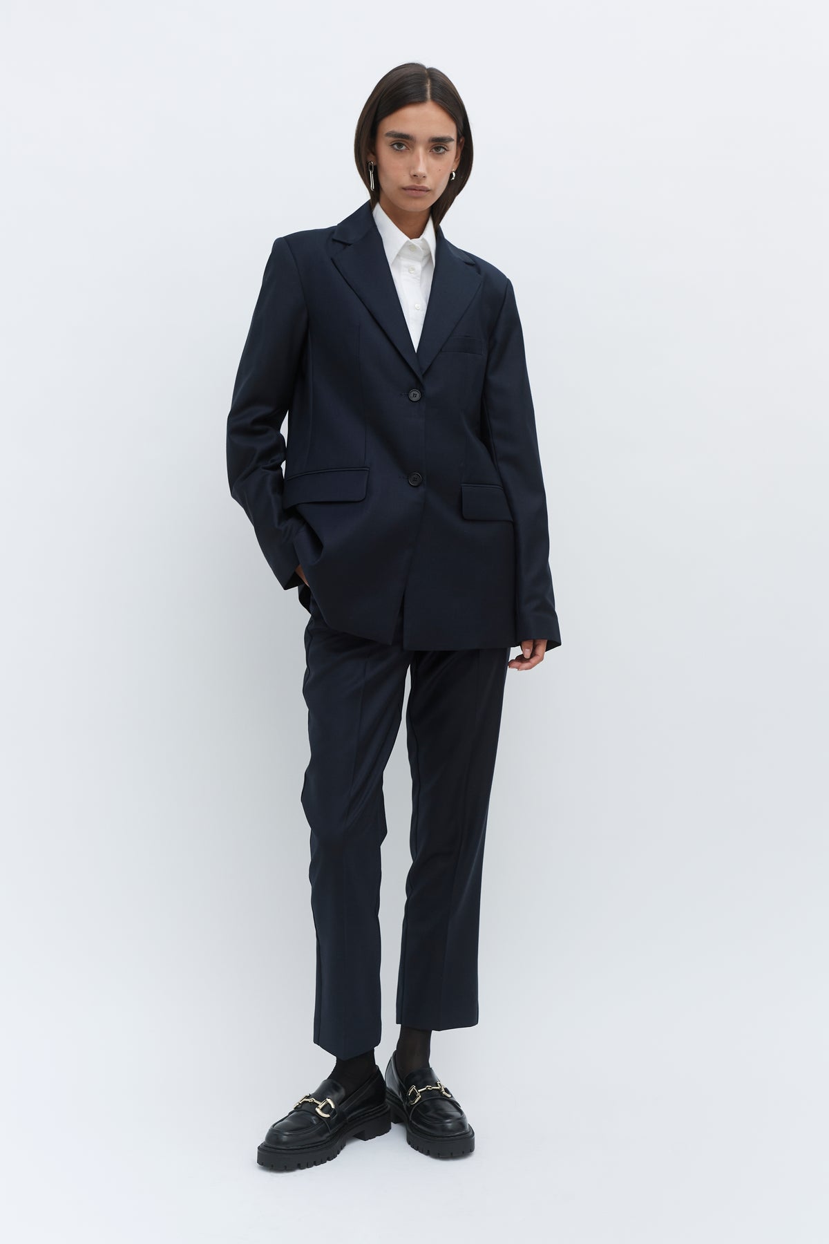 Our Single breasted tailored jacket is made of 100% Wool woven in Yorkshire. The jacket features horn buttons and two front pockets with flaps. The lining is sustainable made from FSC & Eco Vera viscose.