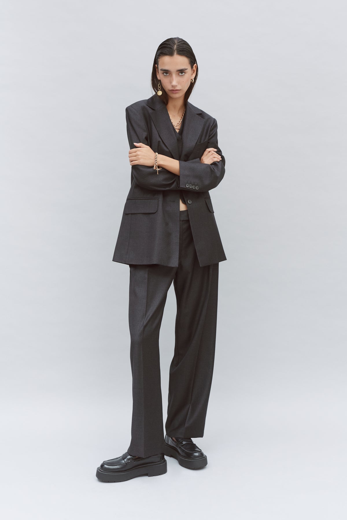 Our grey pleated wide leg tailored trousers are made of 100% wool woven in Yorkshire at the Mill Alfred Brown. The trouser features pleated fronts, belt loops, slanted entry front pockets, invisible front closure and are lined to the knee in sustainable black lining. The internal waistband and fly features a bias binding finish. They can be worn as a full suit with the matching Grey Single Breasted Blazer.