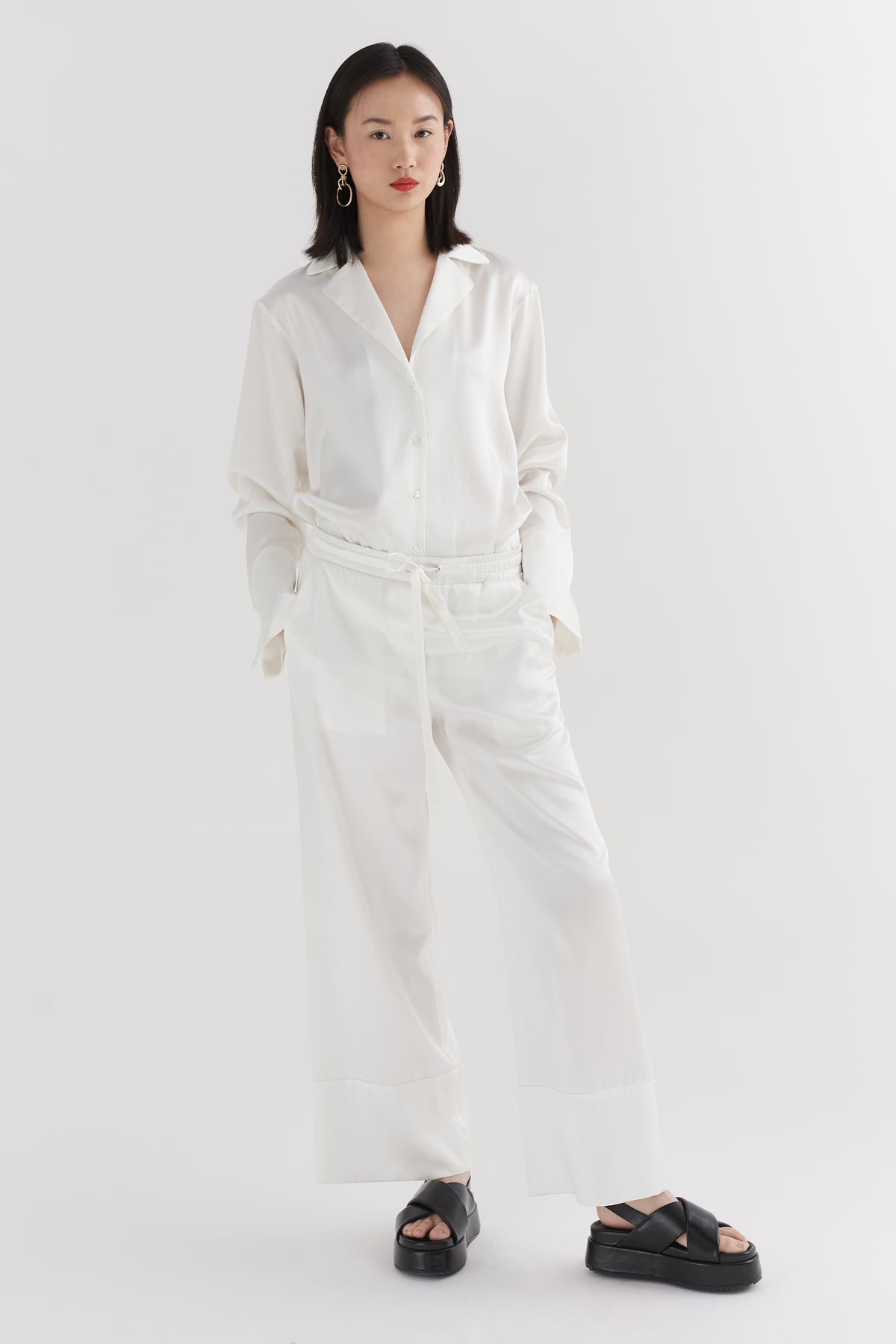A trouser made of 100% Ivory silk. The wide leg floaty trousers features an elasticated waist with a drawstring detail, side entry pockets and a cuff design detail at the trouser hem.