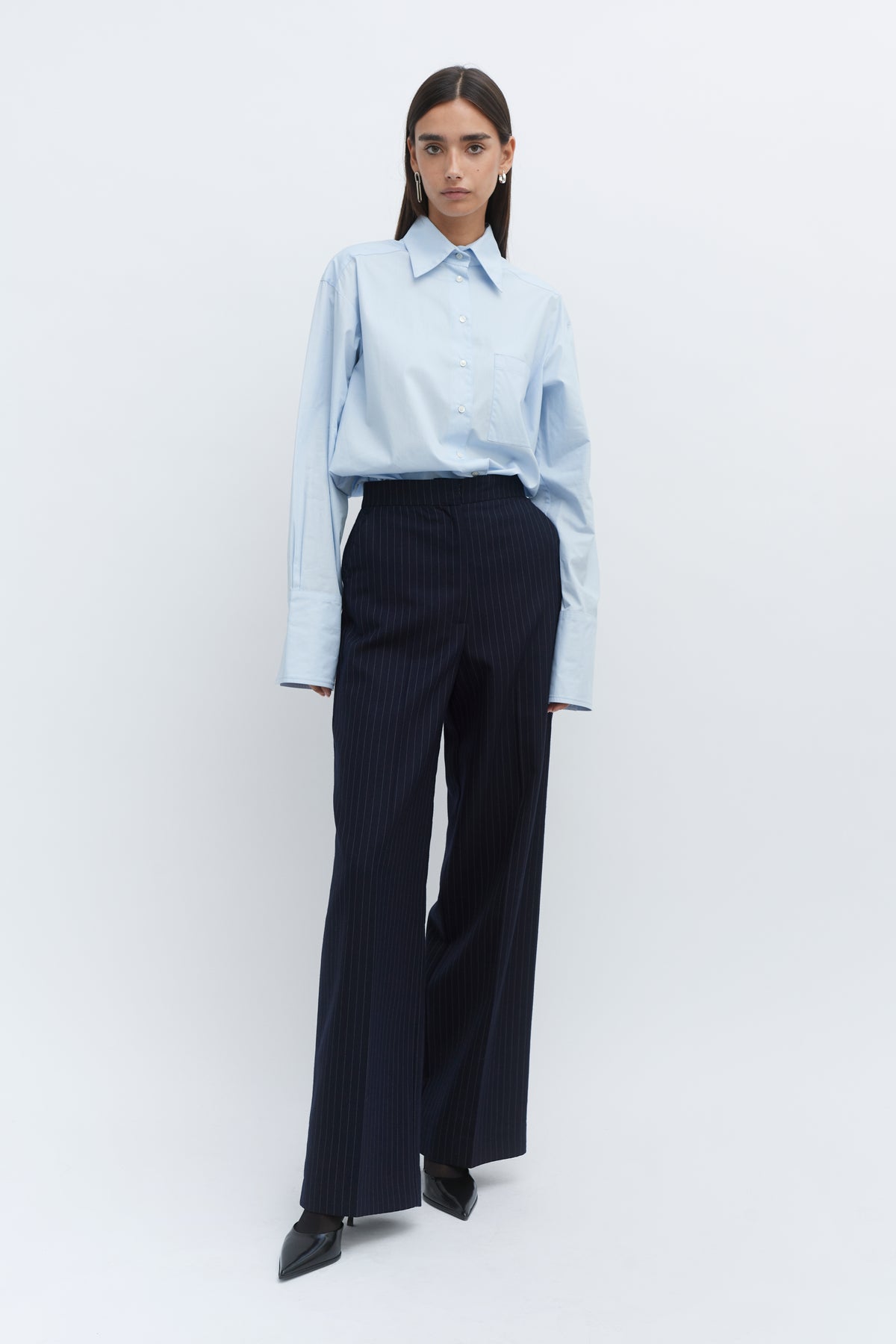 Our wide leg pinstripe tailored trousers are made of 100% wool, woven in Yorkshire. The trouser features pleated fronts, slanted entry front pockets, invisible front closure and are lined to the knee in sustainable black lining. The internal waistband and fly features a bias binding finish. They can be worn as a full suit with the matching Pinstripe Double Breasted Blazer.